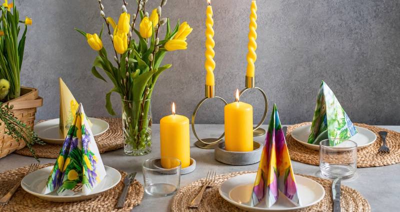 For å sette et festlig preg på påskebordet kan du bruke servietter med påskemotiv eller påskefarger. For å sjarmere litt kan serviettene også brettes i form av kaninører. Ønsker du å ta borddekorasjonen til neste nivå kan du i tillegg legge små dekorerte egg eller sjokoladeegg på hver tallerken. Dette er en fin måte å ønske gjestene velkommen til ditt nydelige påskebord.